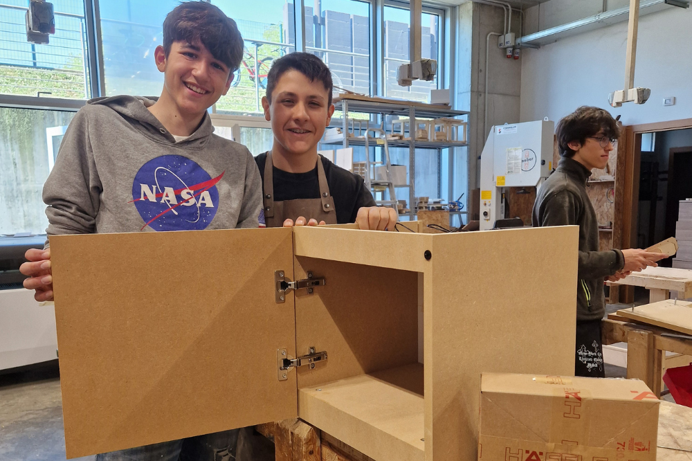 Suddivisi a gruppi, gli allievi hanno utilizzato la ferramenta e componenti messi a disposizione da Häfele. Un elemento centrale del progetto è stato il cablaggio di un sistema di illuminazione LED, attivato tramite un sensore all’apertura dell’anta.