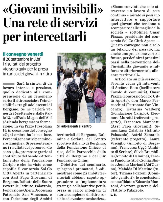 | 23/09/2025 | L’Eco di Bergamo | Giovani invisibili, una rete di servizi per intercettarli |