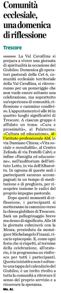 | 24/09/2025 | L’Eco di Bergamo | Comunità ecclesiale, una domenica di riflessione |