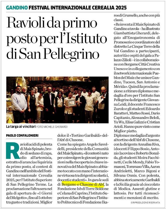 | 26/09/2025 | CL | Valseriana news | Contest del Mais Spinato di Gandino: trionfa l’Istituto San Pellegrino, all’ABF Clusone il miglior dolce |