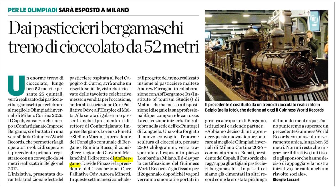 | 13/10/2025 | L’Eco di Bergamo | Dai pasticcieri bergamaschi treno di cioccolato da 52 metri |