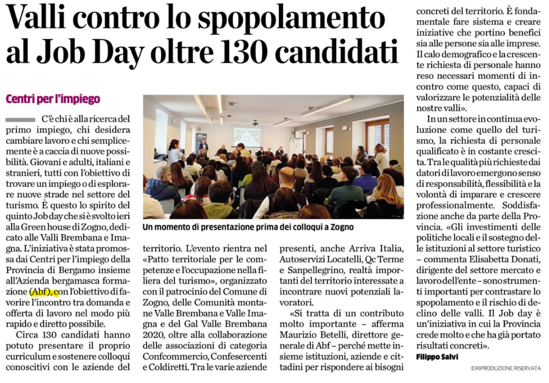 | 06/03/2026 | Eco di Bergamo | Valli contro lo spopolamento, al Job Day oltre 130 candidati |