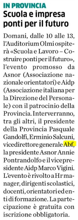 | 05/12/2023 | ABF | Bergamo News | Orientamento e formazione di eccellenza: ABF guida i giovani verso un futuro di successo |