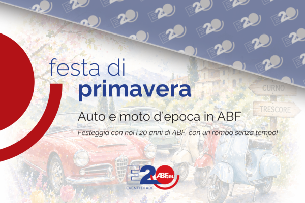 Sabato 9 maggio ABF organizza una festa di primavera speciale per celebrare i suoi 20 anni: una giornata aperta al pubblico con esposizione di auto d’epoca e Vespa storiche nelle sedi di Curno e Trescore Balneario.
