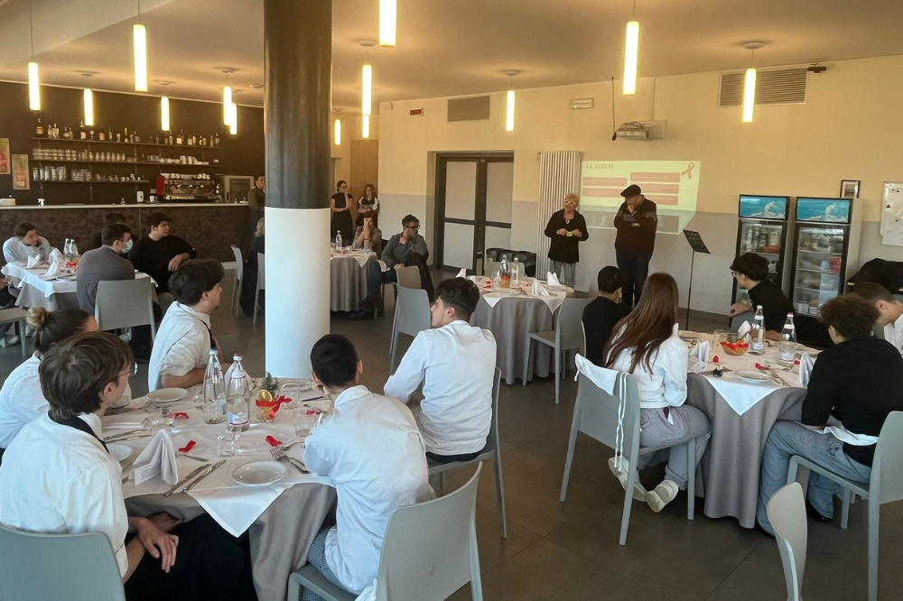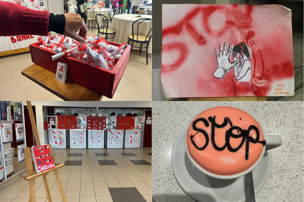 Gli studenti e il personale hanno indossato un capo rosso come gesto collettivo di solidarietà, mentre le classi di Pasticceria hanno realizzato spumiglie rosse, simbolo della vulnerabilità delle donne.
