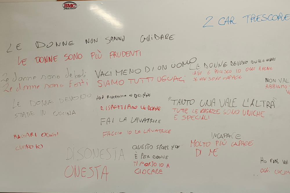 Gli studenti hanno scritto alla lavagna alcune delle frasi stereotipo più diffuse, quelle che spesso minimizzano, giustificano o ignorano la violenza di genere. Accanto a queste espressioni, sono state costruite frasi alternative che ne smontano il significato, proponendo un modo più consapevole, rispettoso e responsabile di leggere i comportamenti e le relazioni.