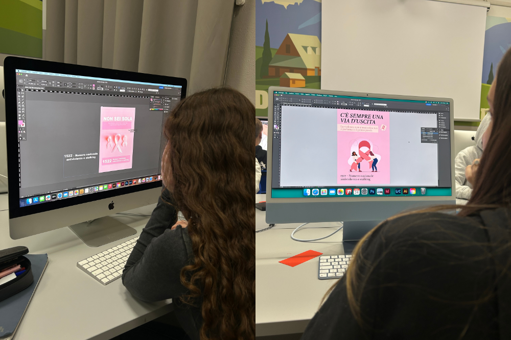 Le classi seconde di grafica hanno inoltre realizzato una locandina che comunica l’importanza di chiedere aiuto utilizzando immagini, illustrazioni e simboli che trasmettono l’importanza di denunciare e di chiedere aiuto, senza ritrarre scene di violenza o di paura.