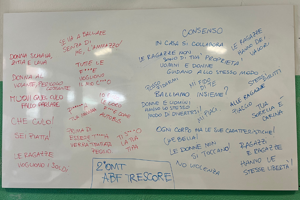 Gli studenti hanno scritto alla lavagna alcune delle frasi stereotipo più diffuse, quelle che spesso minimizzano, giustificano o ignorano la violenza di genere. Accanto a queste espressioni, sono state costruite frasi alternative che ne smontano il significato, proponendo un modo più consapevole, rispettoso e responsabile di leggere i comportamenti e le relazioni.