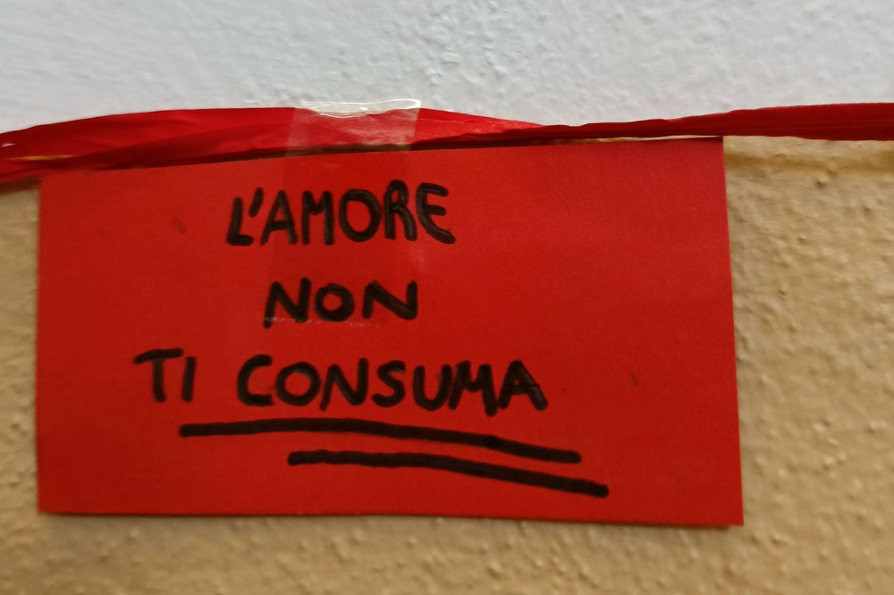 Gli spazi della sede sono stati attraversati da un filo di spago rosso a cui erano appesi cartoncini con parole chiave come Stop, Cura, Libertà, Denuncia.
